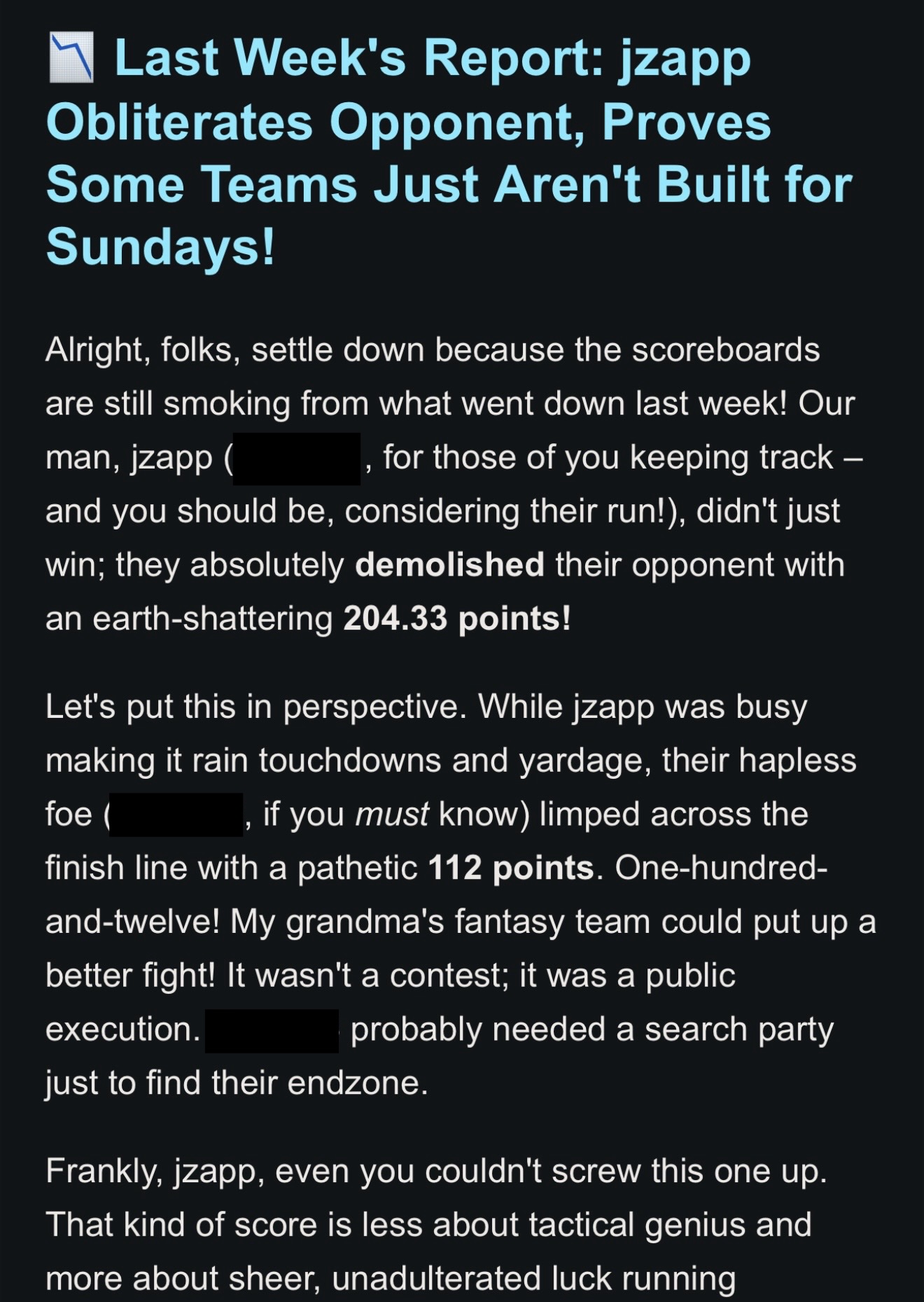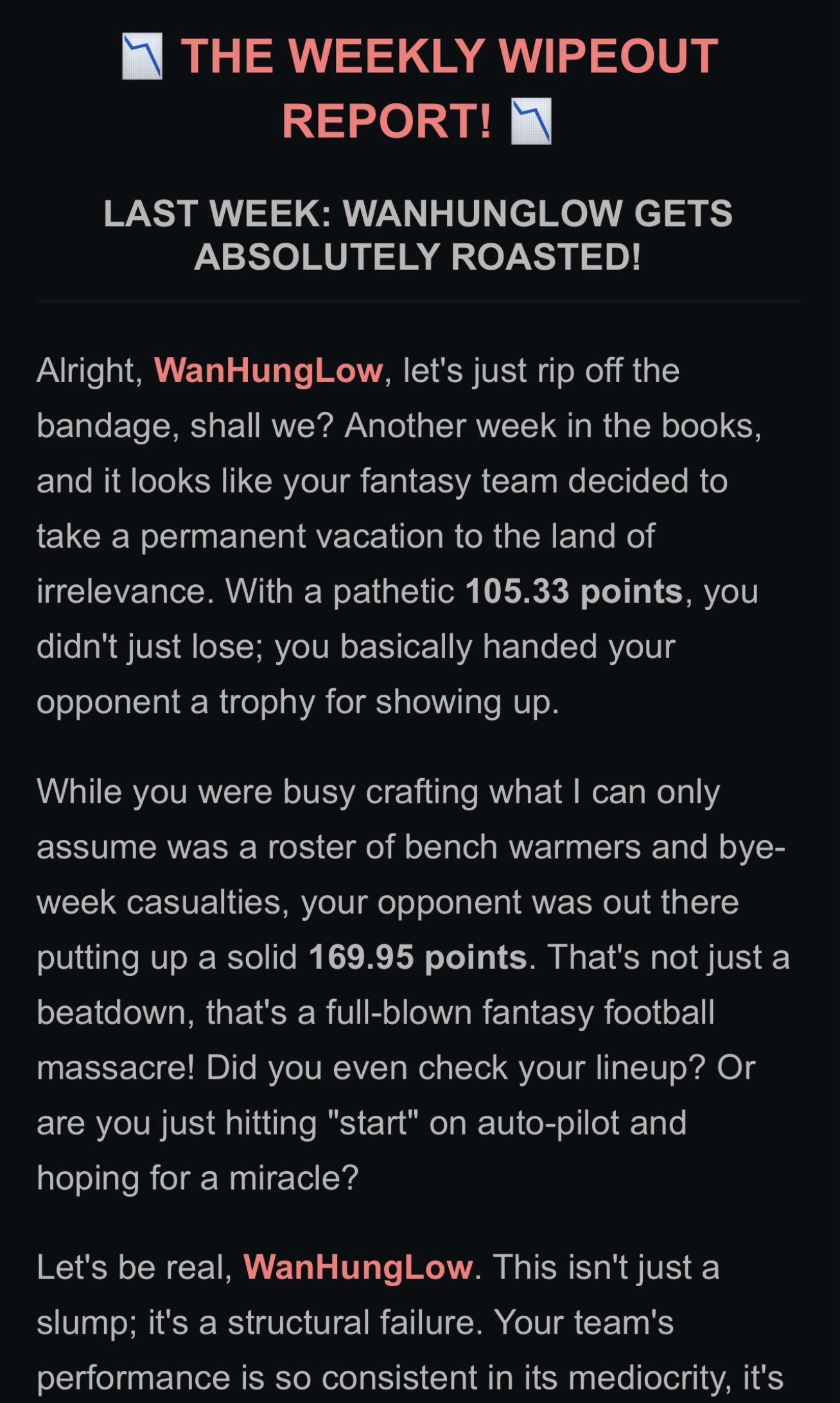 - The Matchup: A recap of your Last Week’s Result (Win/Loss and Score).