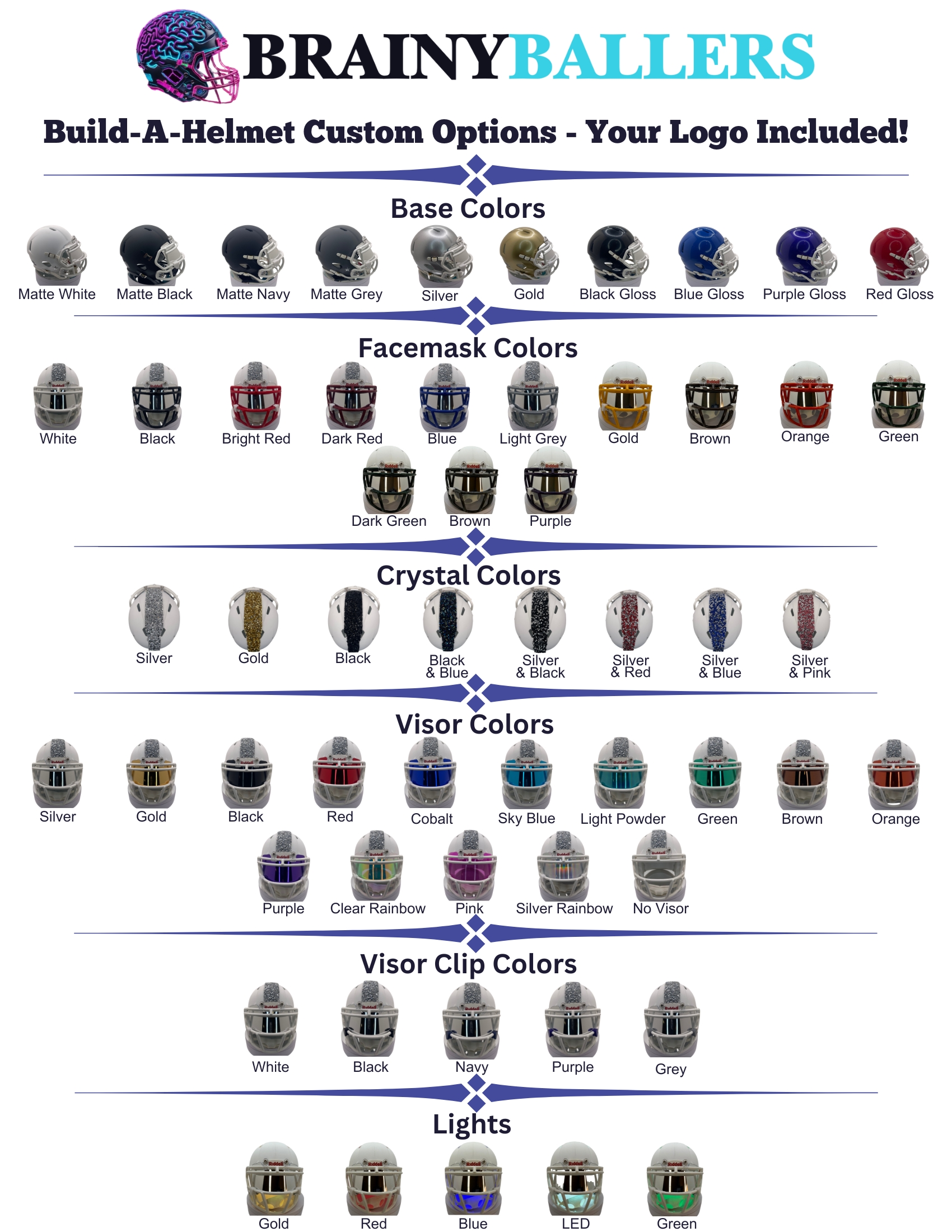 Celebrate your brand with a helmet that mirrors the long hours and dedication you’ve invested into your league. Whether its for selling to your audience with our bulk order discount, or keeping for yourself, we are passionate about bringing brands to everyone in the form of mini football helmets!