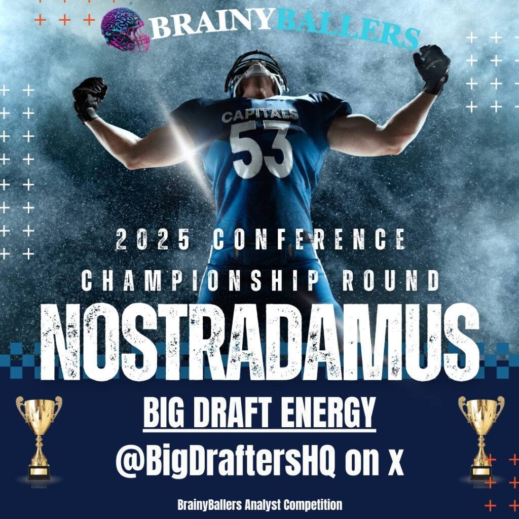 A big shoutout to Big Draft Energy on X, who claimed the title of ‘Nostradamus’ for the 2025 Conference Championship round! Also known as “Disco,” he offers top-notch content on best ball, redraft, and sports wagering advice. Ranked from top to bottom, he was most accurate in predicting Running Backs, Wide Receivers, Tight Ends, and then Quarterbacks.